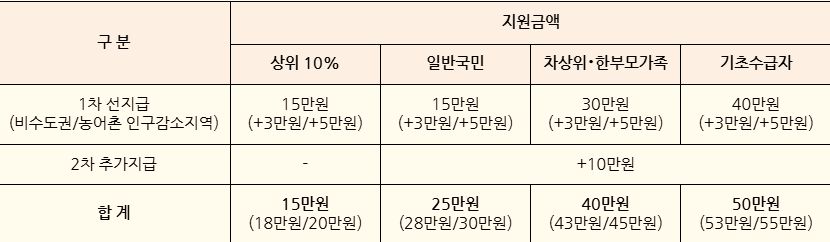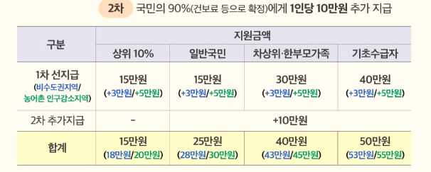 - 일반 국민: 1차 15만 원 + 2차 10만 원, 거주지에 따라 최대 30만 원