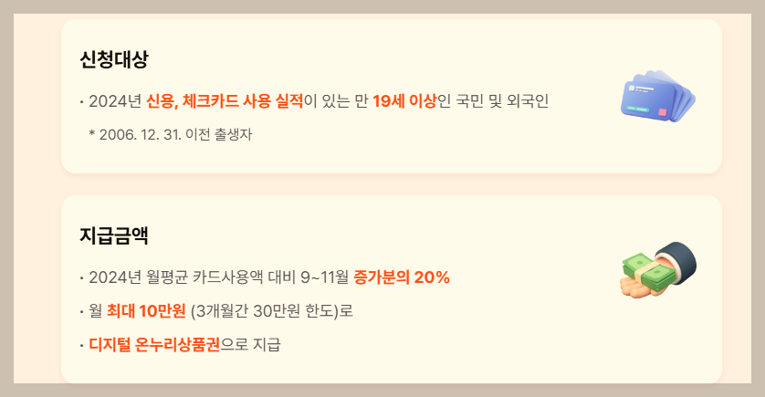 쉽게 말해, 더 많이 소비하면 더 많이 돌려받는 구조로, 월 최대 10만 원, 총 3개월간 최대 30만 원까지 혜택을 받을 수 있어요.