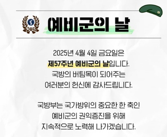 예비군 훈련기간에 대해서 알아보기 전에 2025년 4월 4일이 예비군의 날인 것을 모르는 사람들이 제법 많습니다.
