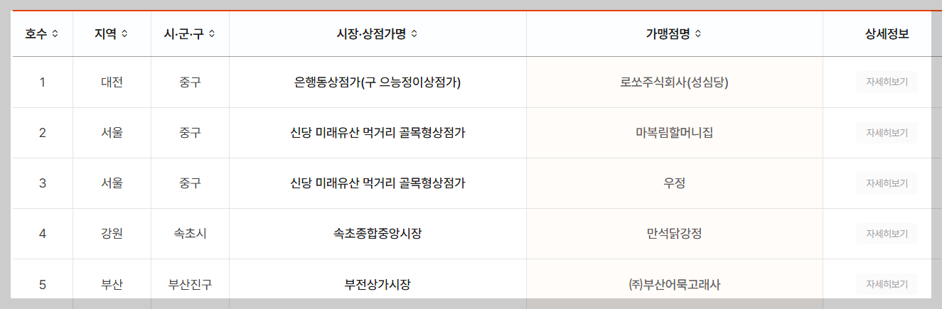시/도, 군/구, 시장명 등으로 지역별 필터링 가능 - 가맹점 정보 확인